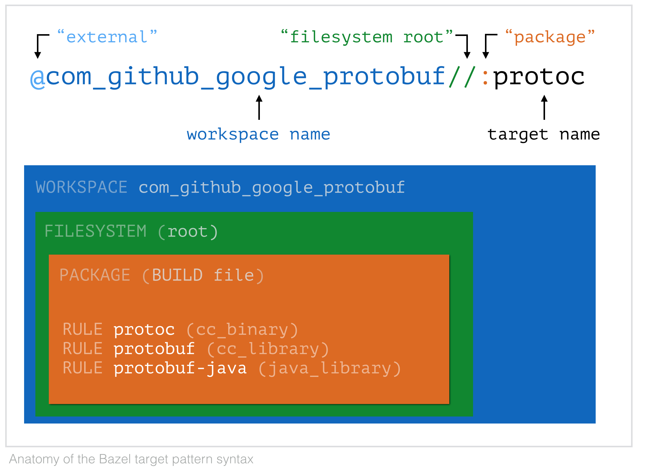 BUILDファイルが存在すると、そのディレクトリはパッケージとして定義されます。BUILDファイルには、ターゲットパターン構文を使用して選択できるターゲットを定義するルールが含まれています。ルールは、skylarkと呼ばれるPythonライクな言語で記述されます。SyklarkはPythonよりも厳密な決定論的保証を持ちますが、意図的に最小限に抑えられており、再帰、クラス、ラムダなどの言語機能は除外されています。
